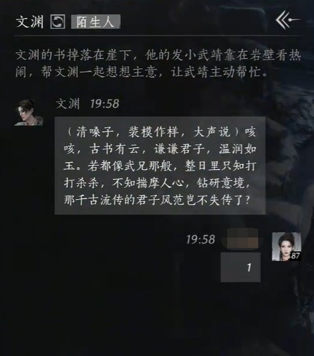 以上就是小编为玩家们带来的燕云十六声文渊对话结交攻略,玩家们需要帮助他想主意使得他的发小武靖愿意帮忙就可以了。