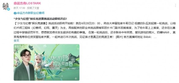 命运方舟全新娱乐竞速活动少女与幻兽即将开启,那么该活动内容是什么呢,本次活动为娱乐竞速挑战活动,第一轮将在4月28日20:00开始,玩家们将以术师三姐妹为主,和其他职业一起挑战黑暗军团长卡门困难难度。