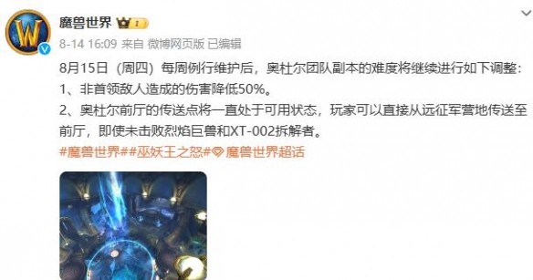 魔兽世界近日调整了奥杜尔团队副本难度,很多玩家都想知道调整了一些什么,下面小编就为大家介绍下魔兽世界奥杜尔团队副本难度调整的公告,一起来看看吧。