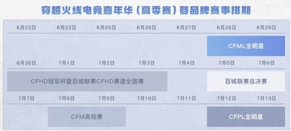 3、其中百城联赛在7月5日-7月6日举行。CFPL全明星在7月12日-7月13日举行。