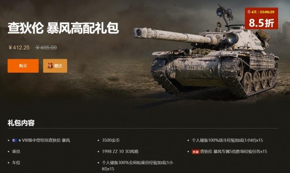 礼包内容:VIII级中型坦克查狄伦 暴风、乘员、车位、3500金币、1998 ZZ 10 3D风格、个人储备300%全局和乘员经验加成(1小时)x15、个人储备100%战斗经验加成(1小时)x15、查狄伦 暴风专属5倍胜场经验任务x15